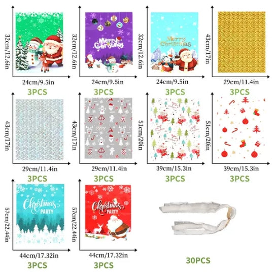 30 gift bags with 30 matching greeting cards and labels,assorted sizes including 12.5 inches (32 cm) and 9.4 inches (24 cm), making them suitable for packing toys, dolls, hats, baked goods, and other holiday surprises of various shapes and sizes.